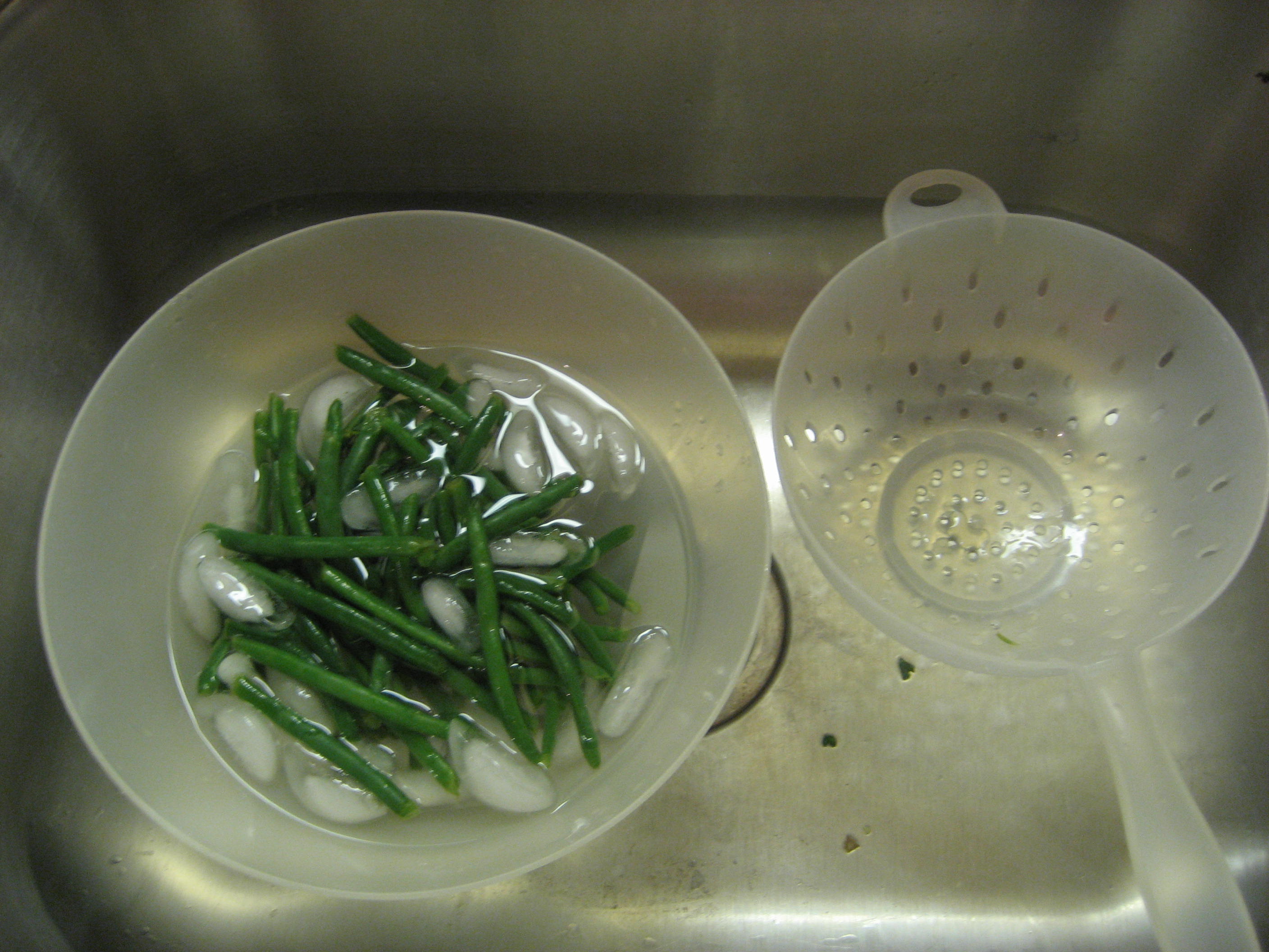 so once you’ve boiled them a few minutes, you drain them, and toss them into an ice bath. like this: