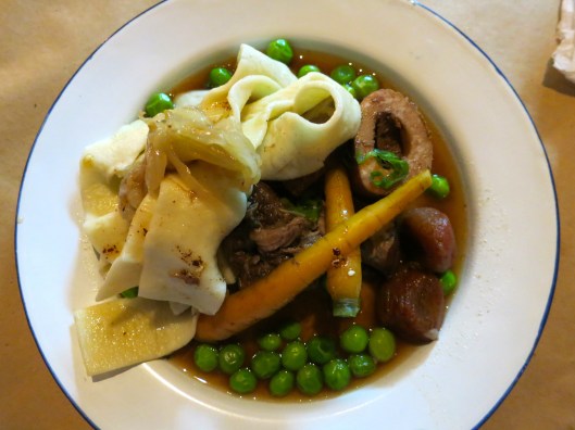 Taiwanese braised short ribs cooked in Chinese herbs with handmade noodles, peas and carrots.