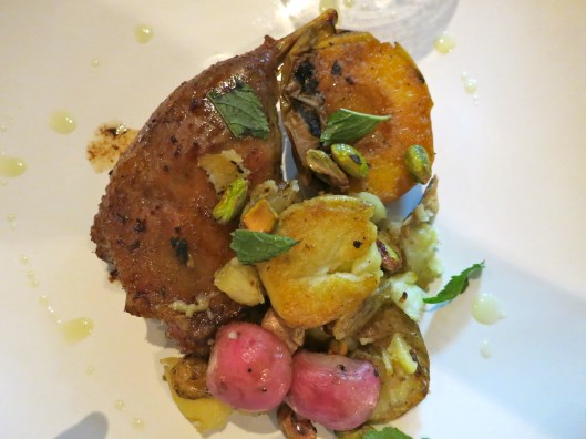 Crisp roasted duck with potatoes, grilled peach and pistachios.