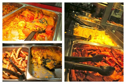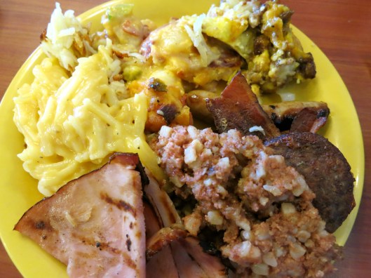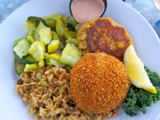 After enjoying a few of those absolutely delicious Bloody Caesars, it was time for more seafood. I ordered the crab cakes, one pan-fried with corn bread crumbs and “low country seasonings” (whatever THAT means…southern-speak for delicious?), and one deep-fried with Old Bay. I preferred the pan-fried version, disproving my theory that deep-frying makes everything more delicious. The sides were pretty bland, but at least they made me feel better about my rabid indulgence in all things fried.